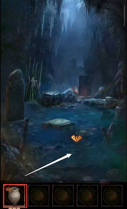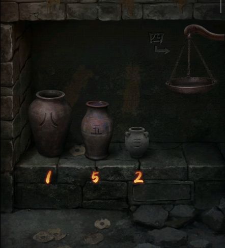 2、根据石块记载,打开墓室门口左边的箱子,获得【陶罐】,使用陶罐在墓室水池处装水,将其泼在烧火阁的门上,石门打开,进入烧火阁,桌上获得【木板版画】。将陶罐放在右边地上,完成小游戏(获得数量为4的水),获得【八卦玉】。