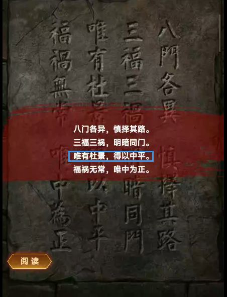 5、使用青铜钥匙打开烧火阁的门,根据藏书阁书上记载的顺序调整机关,场景变换,根据藏书阁墙上石壁记载,把右边的字变为“杜景”字,石门打开。