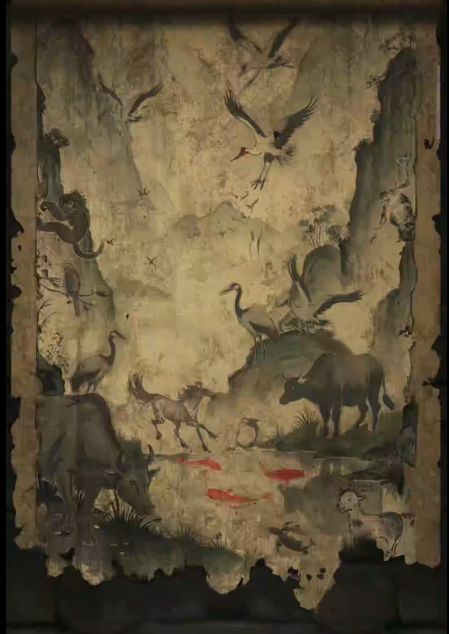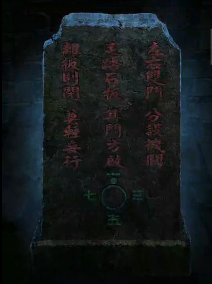 2、根据右边墓室的画可是牛的数量是2,鱼是3,鹤是6,根据左边石碑记载,圆点为1,调整密码箱上的按钮指向正确的位置打开箱子,获得【石板】,把石板放在左边方形缺口上,石门打开。