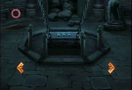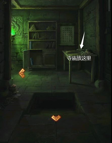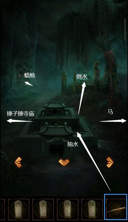 9、使用唧筒抽取中下城池的水,把牛灵墓放进去,把水放进右上城池里,放兔灵墓,最右边爬上最高处,放马,左上把瓷蜡烛安装好,放鼠,最左边使用木槌敲坏,获得【寺庙】,回到走廊处把寺庙安在书桌上,放鸡。