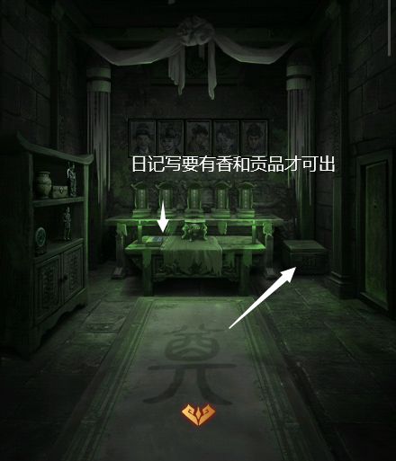 7、把香插在香炉上,贡品放在前面,打开旁边的书第二页,得知要把五个灵墓安置好才可出去,第三页有摆放信息。