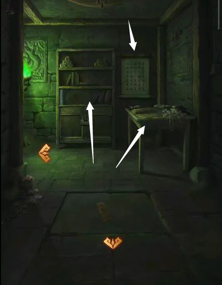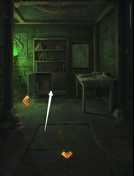 1、进入右边的墓室,书柜上获得一只【石狮子】,把石狮子放在主通道的空缺处,根据墙上的石狮子改变四个狮子朝向,一个密码箱降下来。