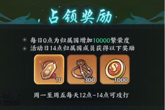 奖励:每日0点为归属国(含盟友)增加1W繁荣度,活动日14点后为归属国(含盟友)成员发送:点将令、缰绳、赛季币奖励。(每周占领5天,单个城池即可获得50抽+缰绳1500,赛季币5000)