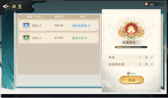 进入「征战四方」玩法即可开启,由国王发起或加入其它国家的联盟,联盟内成员共享(战果:如占领城池奖励等),升级联盟等级需要提交【国运珠】,联盟等级越高和发起的结盟数量越多。