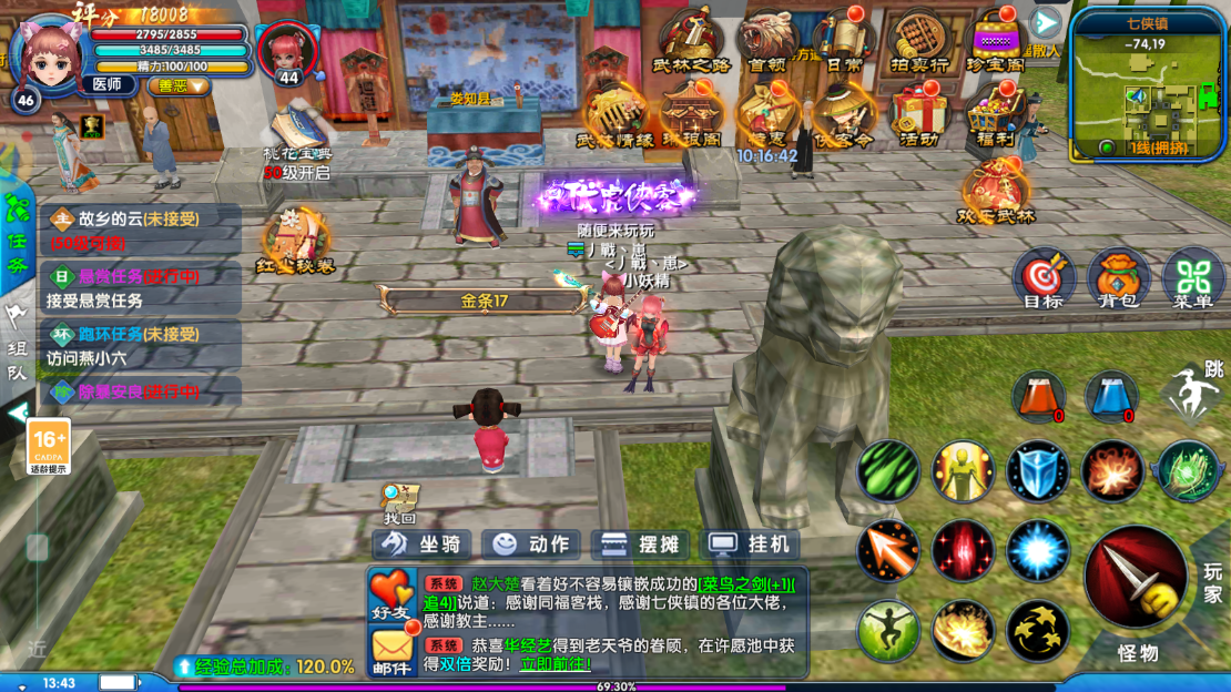 客栈经营系统让你亲手打理同福客栈,从招待客人到装修客栈,感受温馨江湖日常。江湖挑战系统,丰富多彩,七侠镇巡逻惩恶扬善,爬塔、秘境副本、世界BOSS等待你的挑战,每日18:30~21:00帮派传功,押镖,领土战,鸡王争霸等活动开启~可以领取超多福利和礼包哦~而且升级速度也会嘎嘎快~