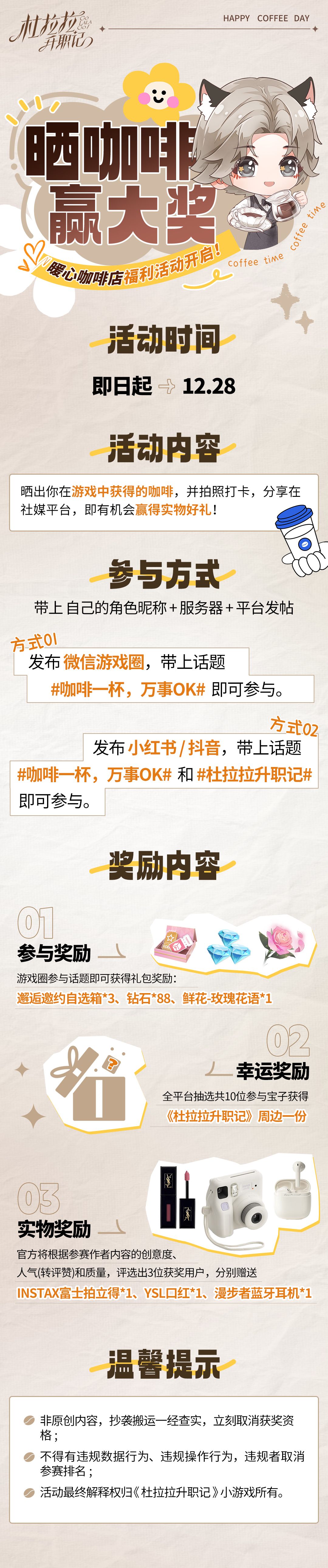 玩游戏,不仅能免费喝咖啡,晒出你的高光时刻,更能赢取拍立得等重磅实物大奖!