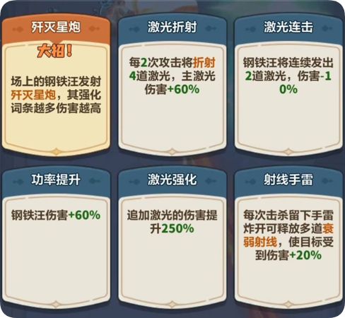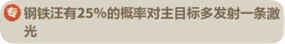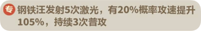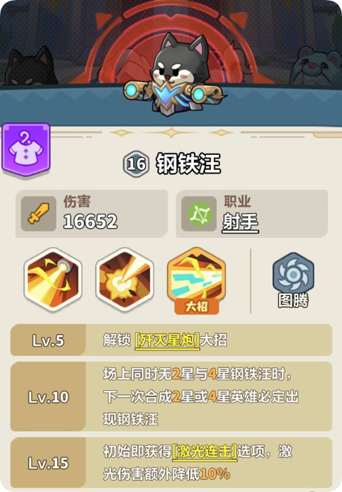钢铁汪是主力输出位置,10级便能使场上没有2星与4星钢铁汪时,下次合成2星或4星英雄必定出现的是钢铁汪。15级自带初始技能激光连击,激光伤害额外降低10%。