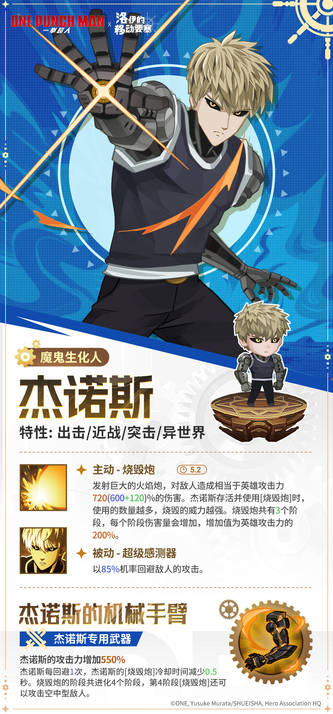以“魔鬼生化人”之名活跃的S级英雄杰诺斯。他因为疯狂的改造人而失去了家人和故乡。后来,他接受了库斯诺博士的身体改造手术,自己也成为了改造人。成为改造人后,他得到了远超常人的速度,以及“烧毁炮”、“机枪拳”等强大的技能和武器,因此拥有了压倒性的破坏力。之后,在见识到埼玉的威力后,他单方面地(?)想要成为埼玉的弟子,并和埼玉一起生活在埼玉的公寓里。