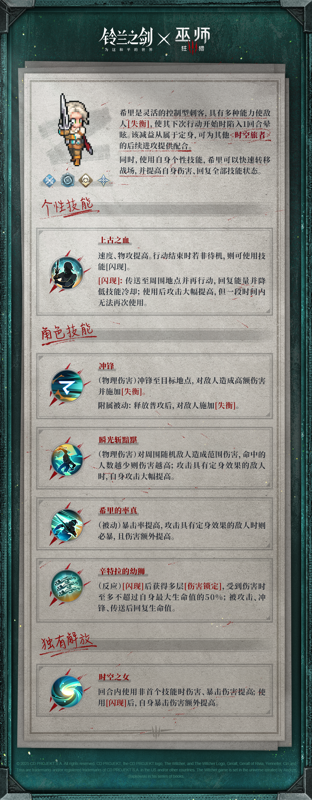 作为上古之血的继承者,希里拥有穿越不同世界的能力,因此被称作“时空之女”。她自出生起便被预言将改变世界,加之她独特的血脉,使她成为狂猎和多方势力追捕的目标。然而一切磨难和凶险都未曾使她畏惧,她凭借勇敢、独立、反叛而坚强的个性,以及在凯尔莫罕接受的训练,蜕变成了一个能够掌握自身力量和命运的强大战士。