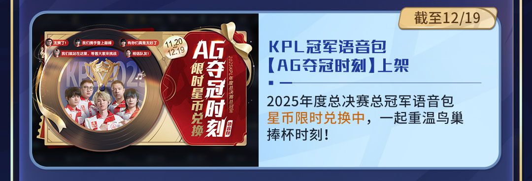 ● AG 夺冠语音包(截至 12.19):2025KPL 总冠军语音包上线,星币限时兑换,重温鸟巢捧杯时刻!