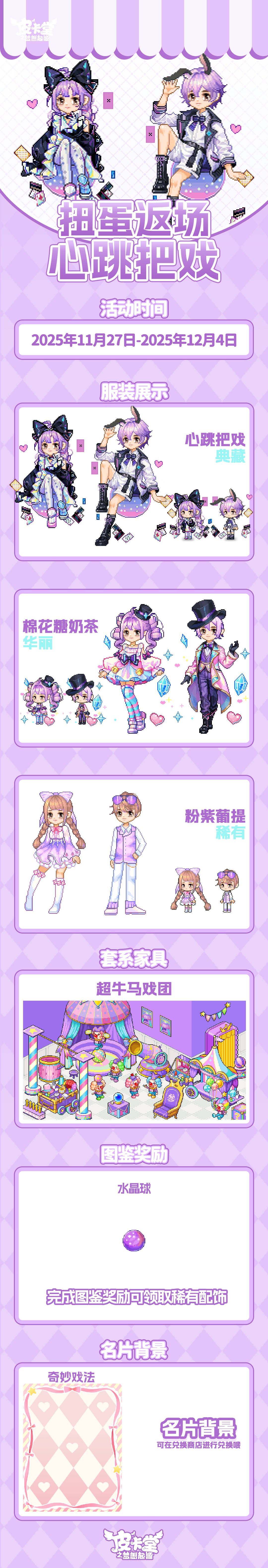 -【限时金币扭蛋】返场!可使用限时扭蛋券/金币抽取,参与可获得典藏套装「心跳把戏」、华丽套装「棉花糖奶茶」、稀有套装「粉紫葡提」,套系家具「超牛马戏团」!完成图鉴收集任务可获得配饰「水晶球」!