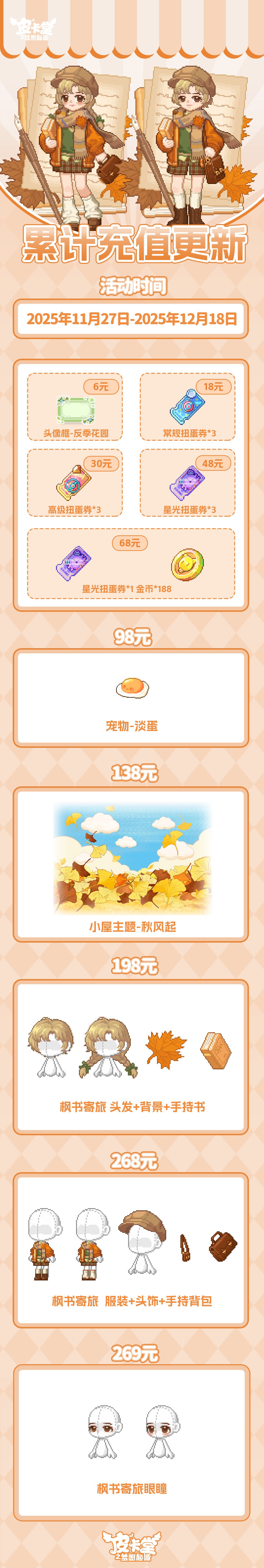 -【累充有奖】可爱宠物「淡蛋」、小屋主题「秋风起」、套系服装「枫书寄旅」等奖励等你来拿!
