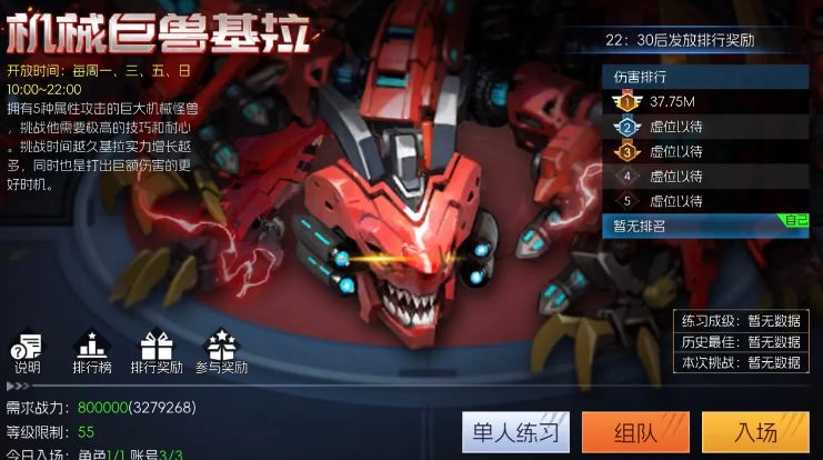 目前,世界boss·机械巨兽基拉的开放时间为:每周一、三、五、日10:00-22:00,每天只有1次挑战机会,记得要在网络条件较好的情况下进行挑战哦!挑战成绩会计入排行榜,22:30后会发放排行奖励。为了获得更好的名次,勇士们可以先进行单人练习,熟能生巧后再去进行挑战。