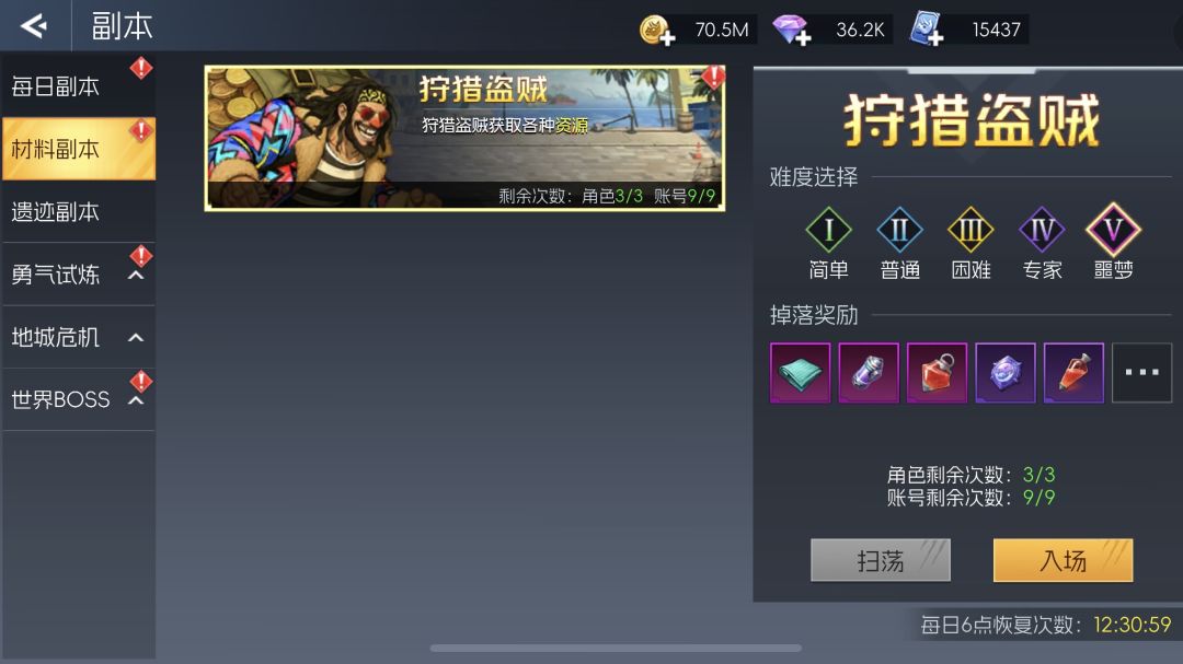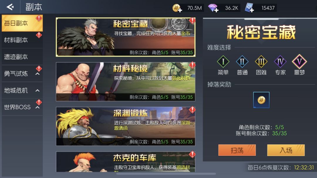 游戏中的每日&材料副本共5个,分为简单、普通、困难、专家、噩梦的难度,达到等级条件即可直接解锁。每日单个角色都有特定的次数限定,同一账号也有次数限定,会根据VIP等级有一定的增加。