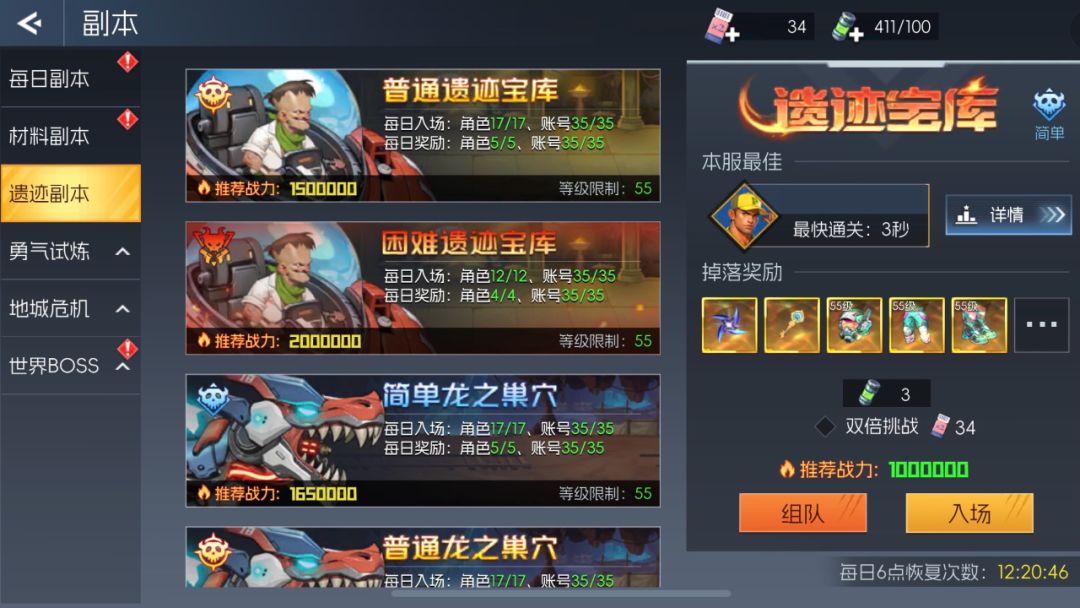 挑战玩法55级开启,分为“遗迹宝库”和“龙之巢穴”两个副本,各自区分简单、普通、困难的难度。每日单个角色都有特定的次数限定,同一账号也有次数限定,次数会随vip等级的增加而有一定提升。目前设定未通过战斗不会减少体力和次数。
