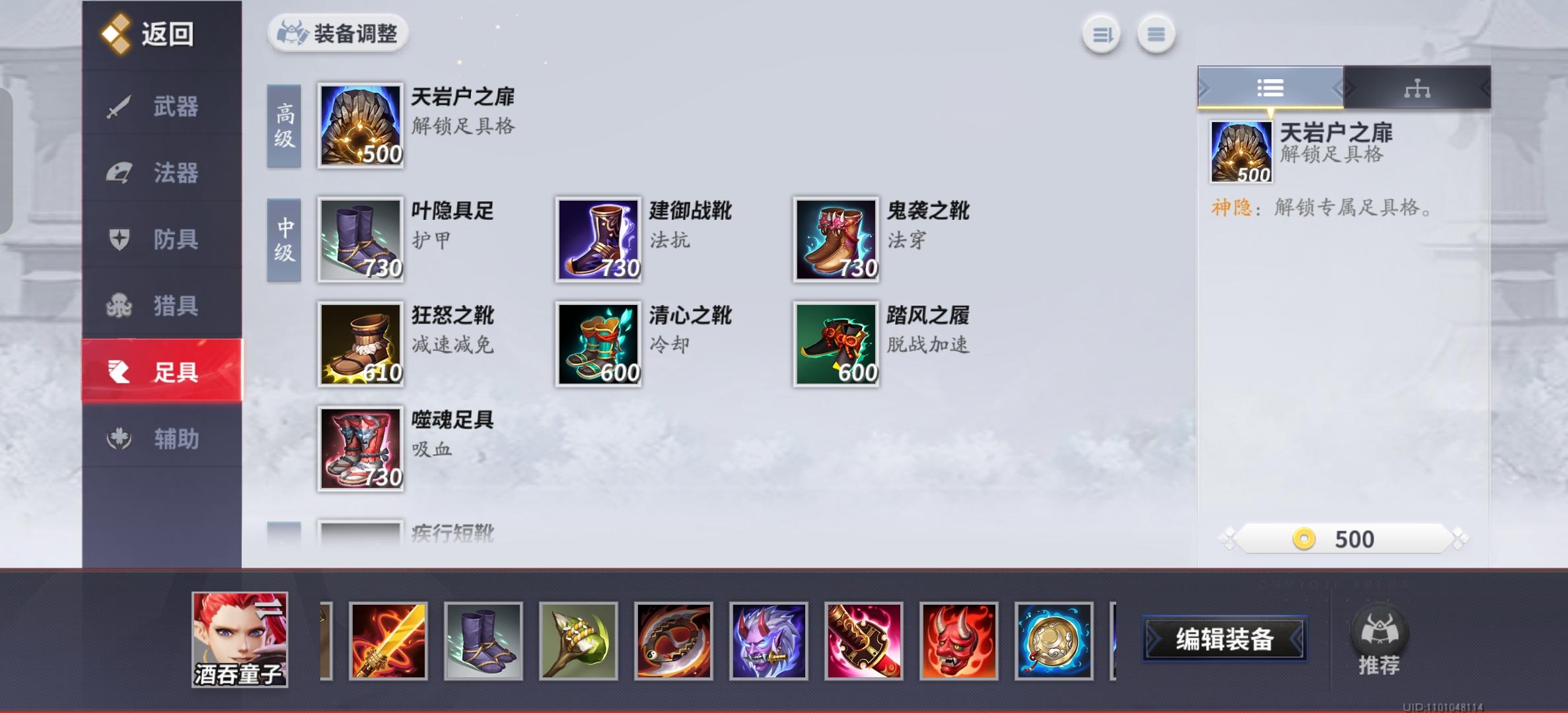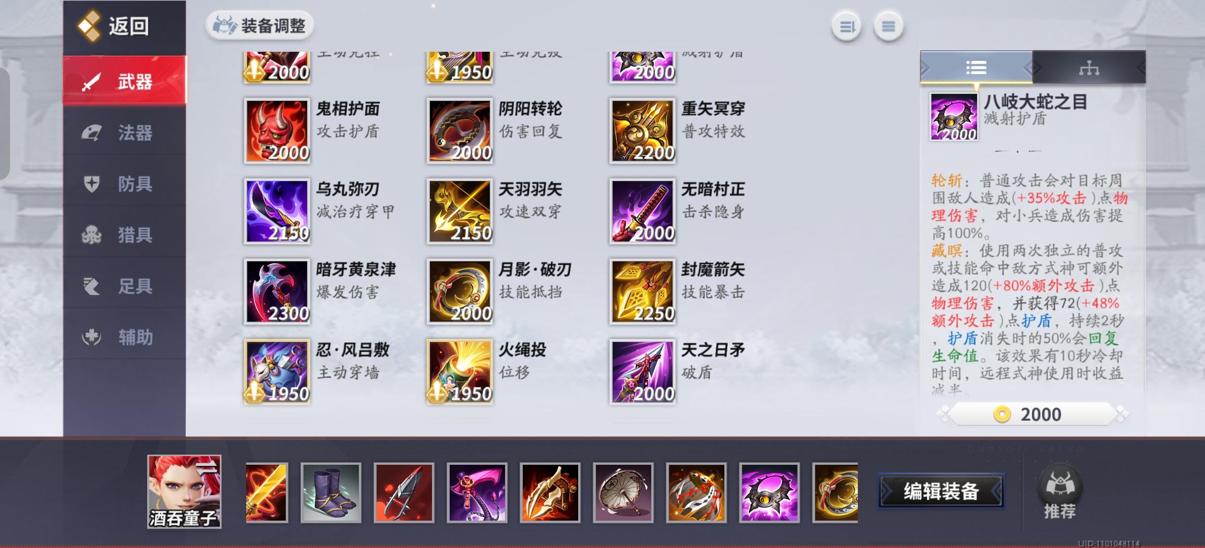 像酒吞这种自身具备基本的清线能力的战士打野,你可以选择在第六件补蛇目或转轮,前中期留出位置给其他契合该式神的装备。