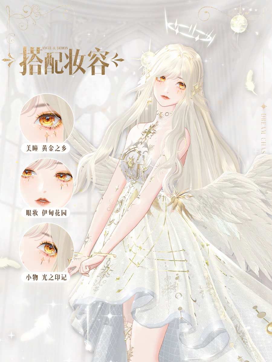 纯白色长卷发,发尾稍微勾勒些许明亮金色,佩带着象征圣洁的天使之环,守护光明驱散黑暗。