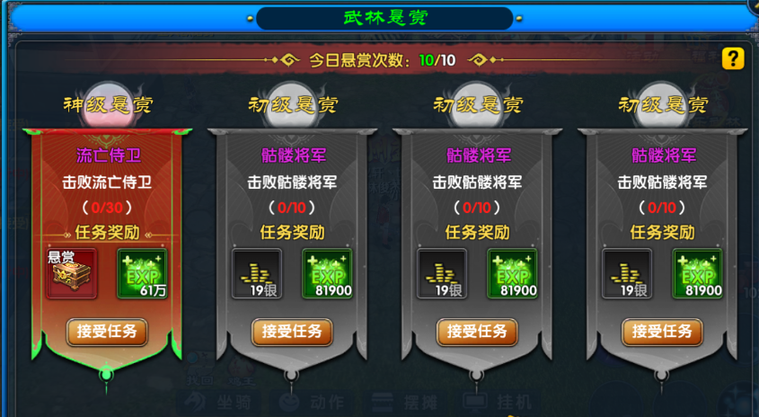 20级到30级这个阶段哈,多去做做日常任务,做完那经验可都是翻倍给的,老划算了!每日必做“武林悬赏”:接橙色、紫色品质的任务(用“悬赏令”刷新),经验比白色任务高3倍,还能得铜钱和强化材料。