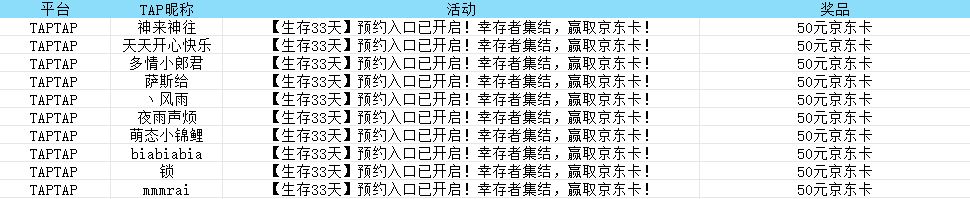 奖励开奖公示:恭喜以下获得奖品的幸存者!