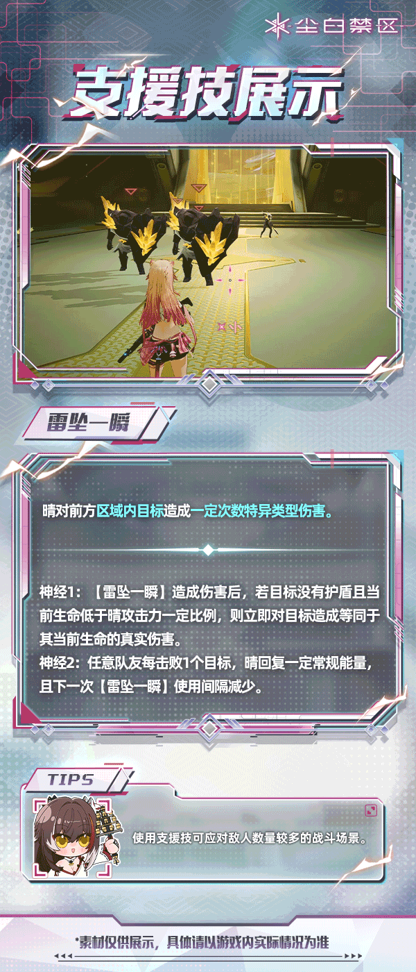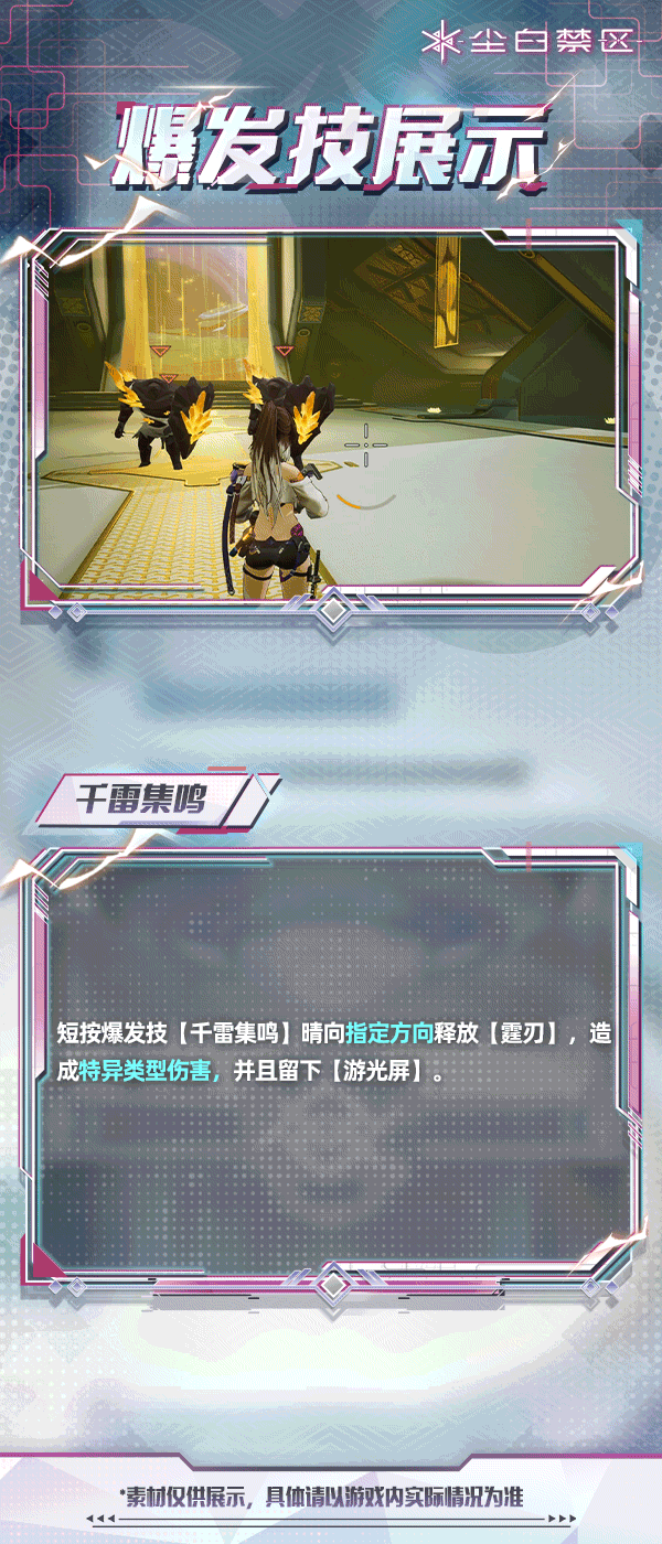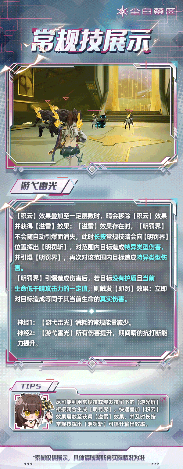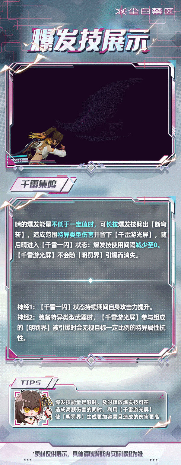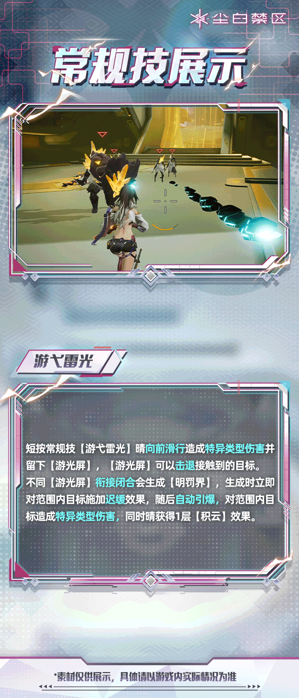 晴-霆光是使用突击步枪的特异类型伤害的技能输出角色。战斗中,晴主要使用常规技或爆发技留下的【游光屏】衔接闭合生成【明罚界】,并引爆【明罚界】进行伤害输出;爆发能量足够时,及时释放爆发技并留下【千雷游光屏】,利用【千雷游光屏】生成【明罚界】可使其造成的伤害更高。