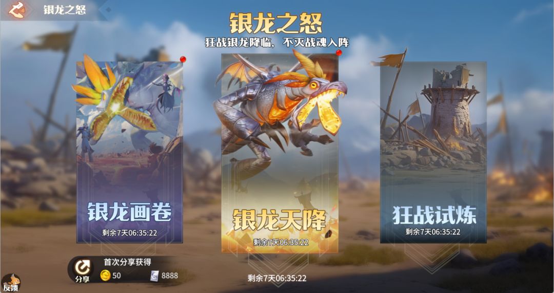 活动简介:三大活动齐聚,银龙觉醒、战魂不灭,参加无限制,分享即得奖!(首次分享活动界面秒领50龙币+8888银片)