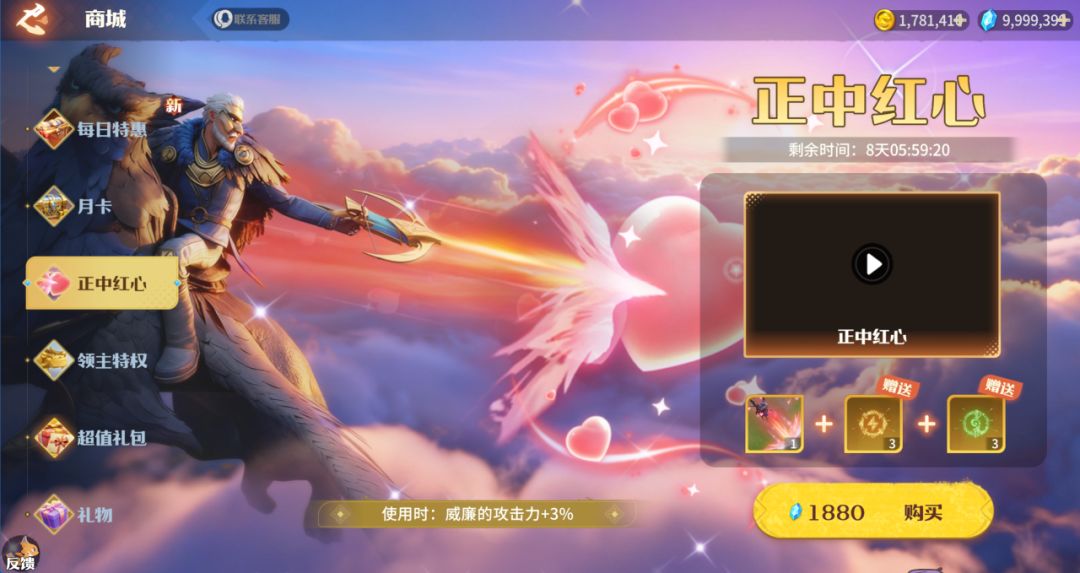 活动简介:1880钻石购买「正中红心:技能特效」,使用后为英雄威廉永久提升3%攻击力!附加奖励:电磁力场·烟花、万物复苏·烟花。
