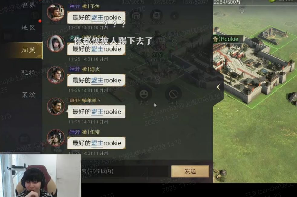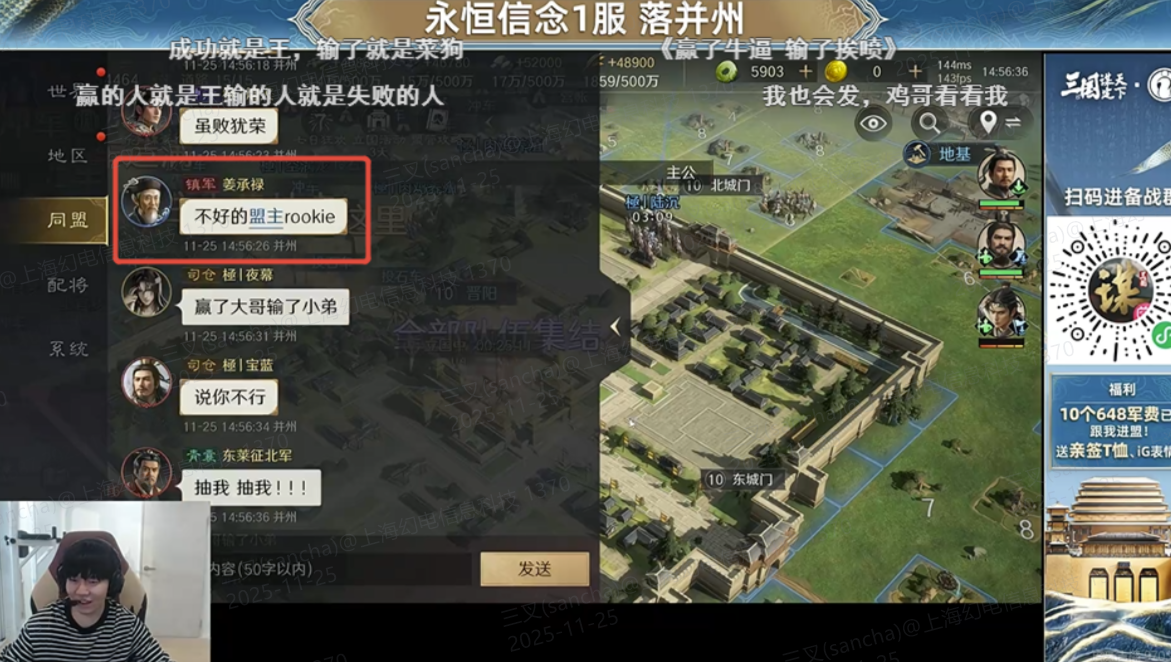 Rookie见状,不慌不忙地在同盟频道称“我是天!”,并随手发起“输入‘最好的盟主rookie’抽648”活动。