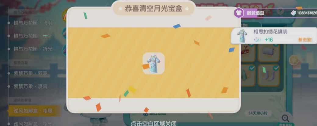 【月光宝盒:逆风如解意】活动内容:发展家使用月光水晶即可抽取全新联动服饰套装“逆风如解意·相思”、“逆风如解意·相守”。活动开启期间,抽取的单个宝盒内的宝物不会重复,12次之内必定获得单个宝盒全部宝物。在抽到月光特品(大奖)时,将会直接获得宝盒中所有剩余未获得的宝物。