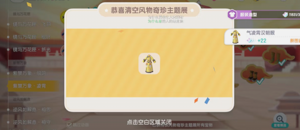 风物奇珍主题展:紫禁万象活动内容:发展家使用展演通票即可抽取全新联动服饰套装“紫禁万象·驭鸿”、“紫禁万象·凌霄”。活动开启期间,抽取的单个展品不会重复,10次之内必定获得单个主题展全部展品。在抽到风物奇珍(大奖)时,将会直接获得展演中所有剩余未获得的展品。