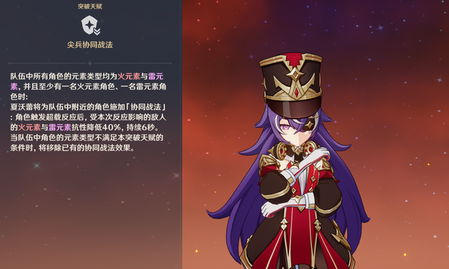 这个队伍的特色就是造价便宜,只需要一个5星角色,其余三个都是4星,其中核心角色是夏沃蕾,0命就能为这个队伍,提供40%的攻击力,以及40%雷火减抗,6命夏沃蕾还能提供高额的雷火元素伤害加成。