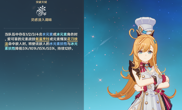 芙芙大招提供高额增伤的同时,自己的海鲜也有不俗的伤害,申鹤战技和大招,都能提升丝柯克伤害上限,尤其是爱可菲,对敌人直接减少冰水抗性55%。