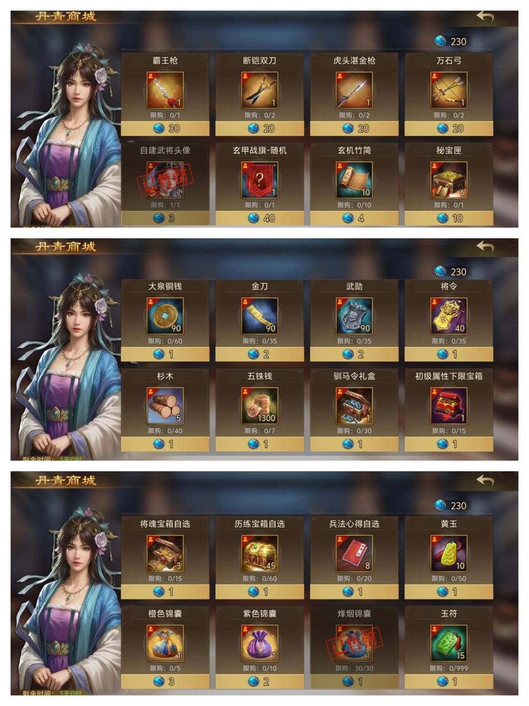 - 活动商店里的武器平时要氪金才能买,如果想买就买往期武器(20)不要买当期(30)省珠子,且这些武器中一级就能用且最有用的就是万石弓,搭配枭姬营援射能回合外减敌方武将很多体力使其放不出技能(简单 普通剧本模式敌方不会放技能,只会普攻)