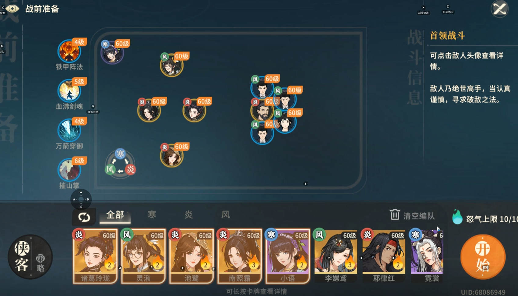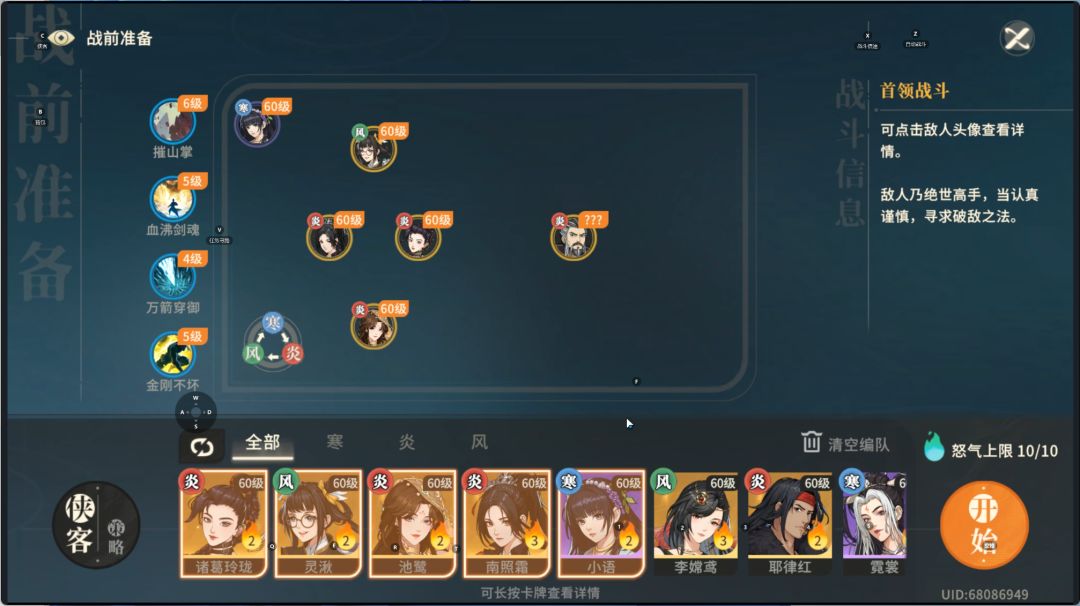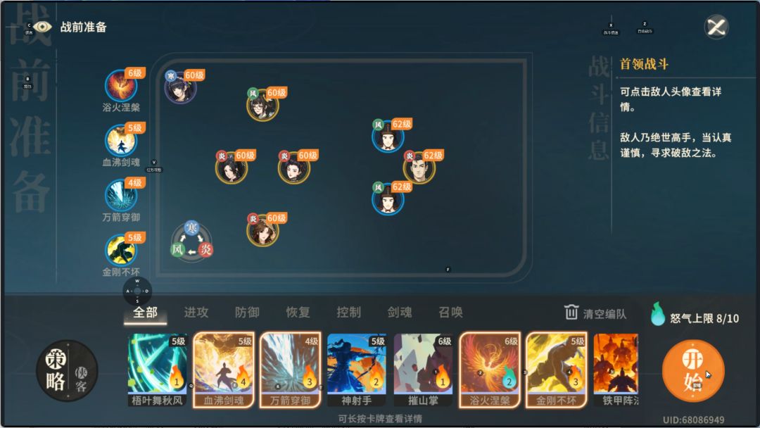 策略卡:血沸剑魂、万箭穿御、神射手、无敌、铁甲阵法、梧叶舞秋风、摧山掌、浴火涅槃。