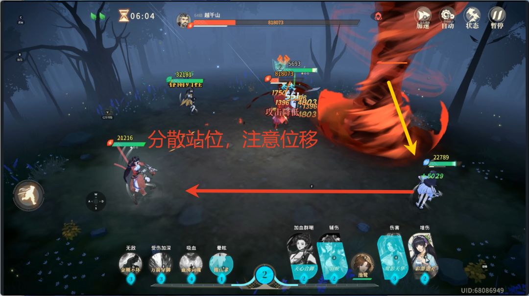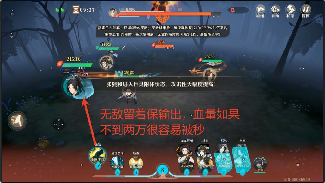 2.巨灵附体——变身,大跳!高额群上,如果输出比较脆,建议上金刚不坏。第一轮用金刚不坏扛,第二轮靠浴火涅槃硬吃,正常BOSS抗不到第三轮就死了。