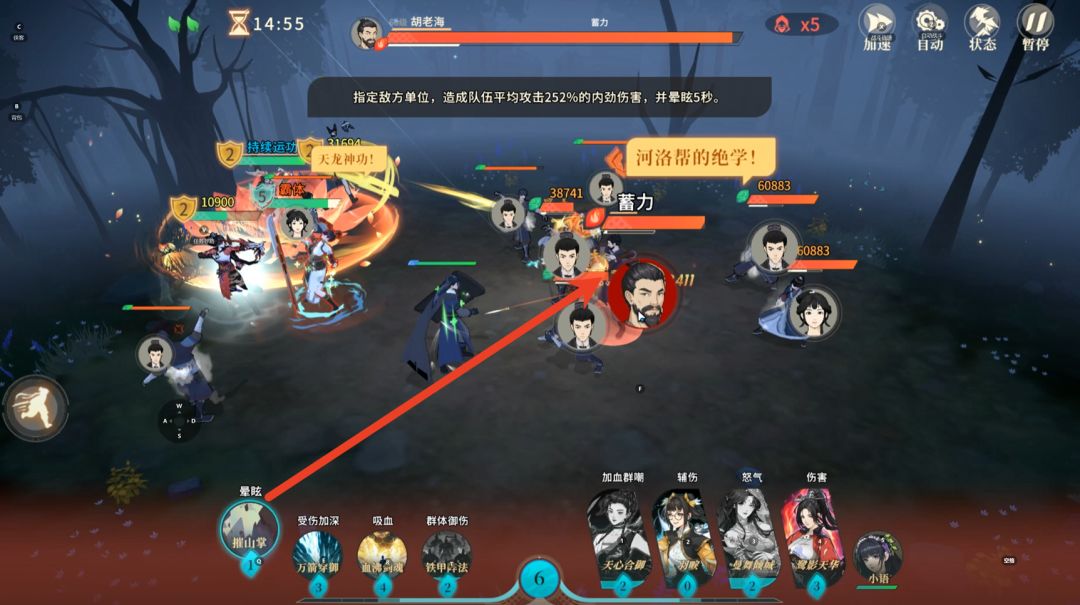 2.主动:河洛霸天掌——读条技能,用摧山掌单体眩晕打断。否则会点三个角色的名,较高伤害。