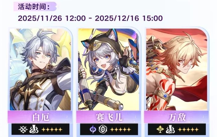 崩坏星穹铁道3.7版本下半卡池于11月26日正式开放,复刻角色为五星主C白厄、赛飞儿及万敌。其中白厄被玩家调侃为"原始人主C",虽定位为虚数毁灭命途的顶尖输出,但需依赖2命魂与专武支撑强度,0命表现平庸且配队成本高,仅建议已有1命玩家补强。而赛飞儿作为追击体系售后角色,在当前群怪环境下适配性不足,万敌则因机制落后沦为"路边角色",两者均被多数玩家视为仓管选项。