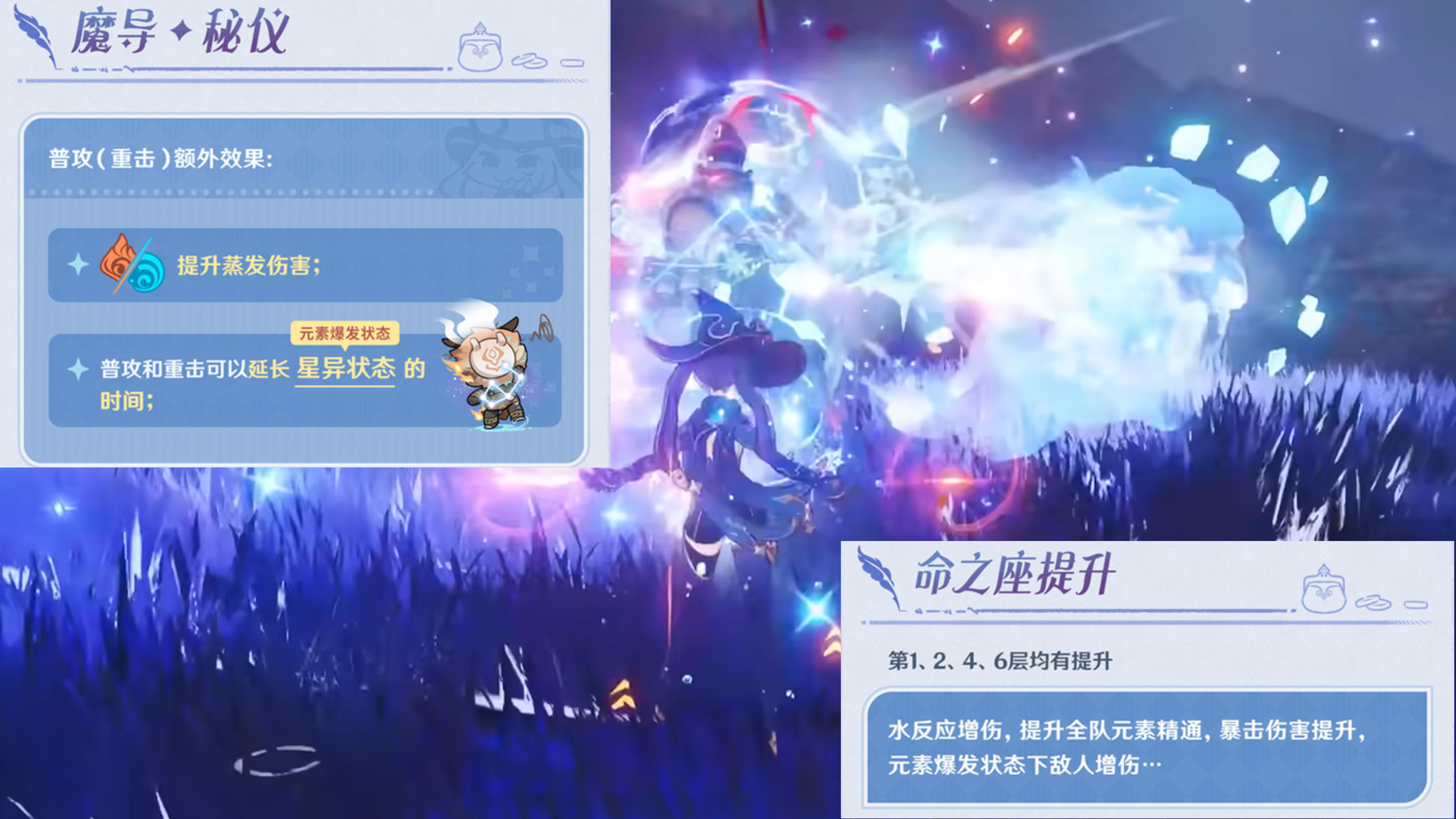 角色本体:普攻、重击时提升蒸发伤害,并能额外延长元素爆发的星异状态持续时间。