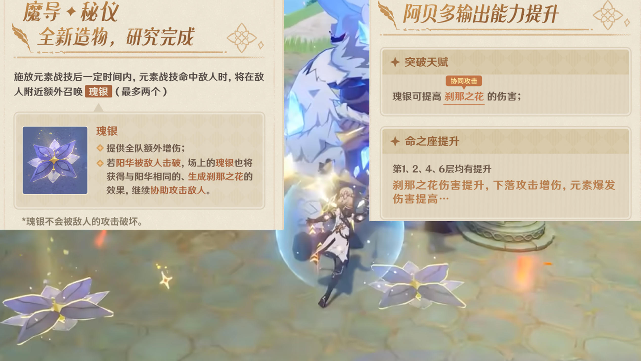 角色本体:战技命中敌人会生成“瑰银”,拥有“阳华”相同效果,但无碰撞体积与生命值,不会被敌人打爆。此外当“瑰银”存在时全队获得增伤效果,阿贝多自身输出也会提升。