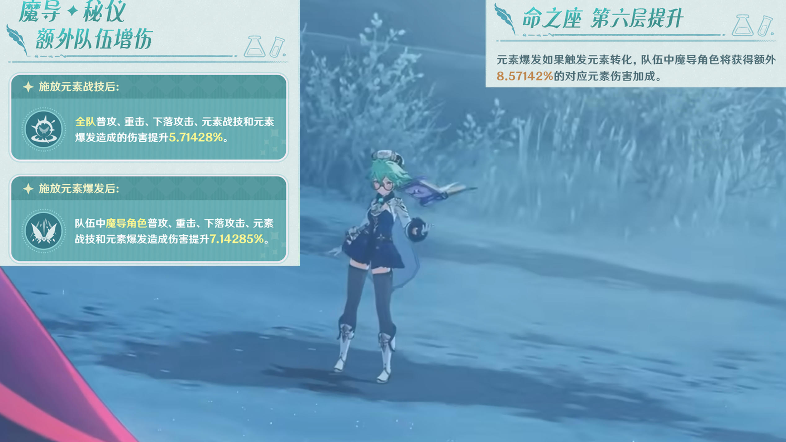 命之座:6命时触发染色效果,魔导角色获得对应元素增伤8.57142%。