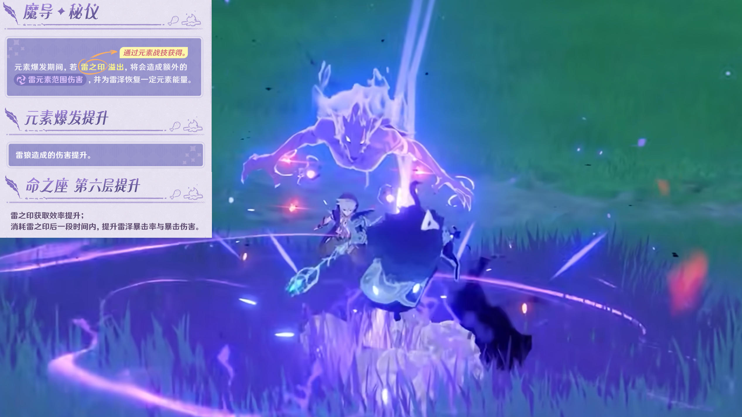 角色本体:自动消耗溢出的雷之印,将其转化为范围雷伤与充能。此外元素爆发召唤的雷狼伤害提升。命之座:6命提升雷之印获取效率,并且消耗后提升双暴数值。