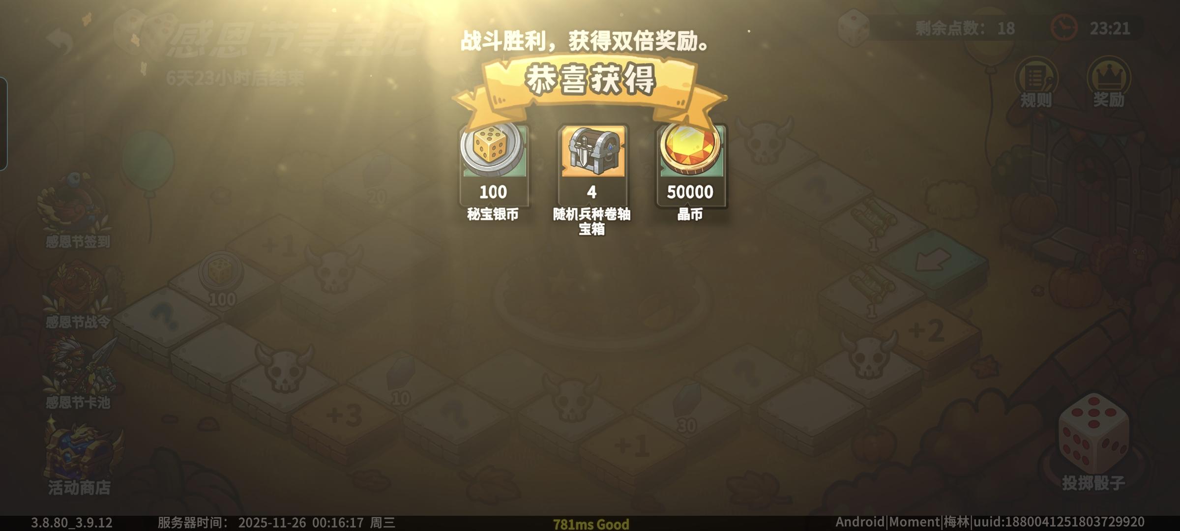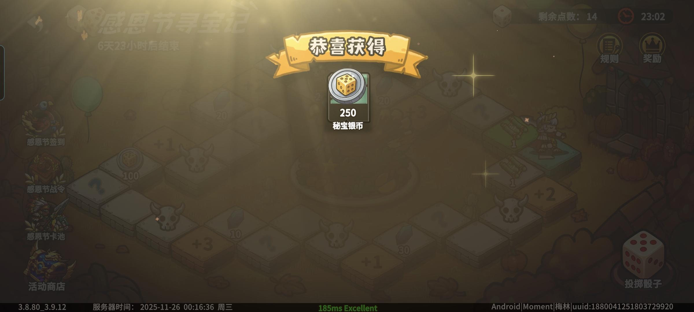 这次活动很简单,类似飞行棋,骰子摇到几就走几步,怪关要打会给币,特定格子也会直接送100币以及蚊子腿道具奖励。