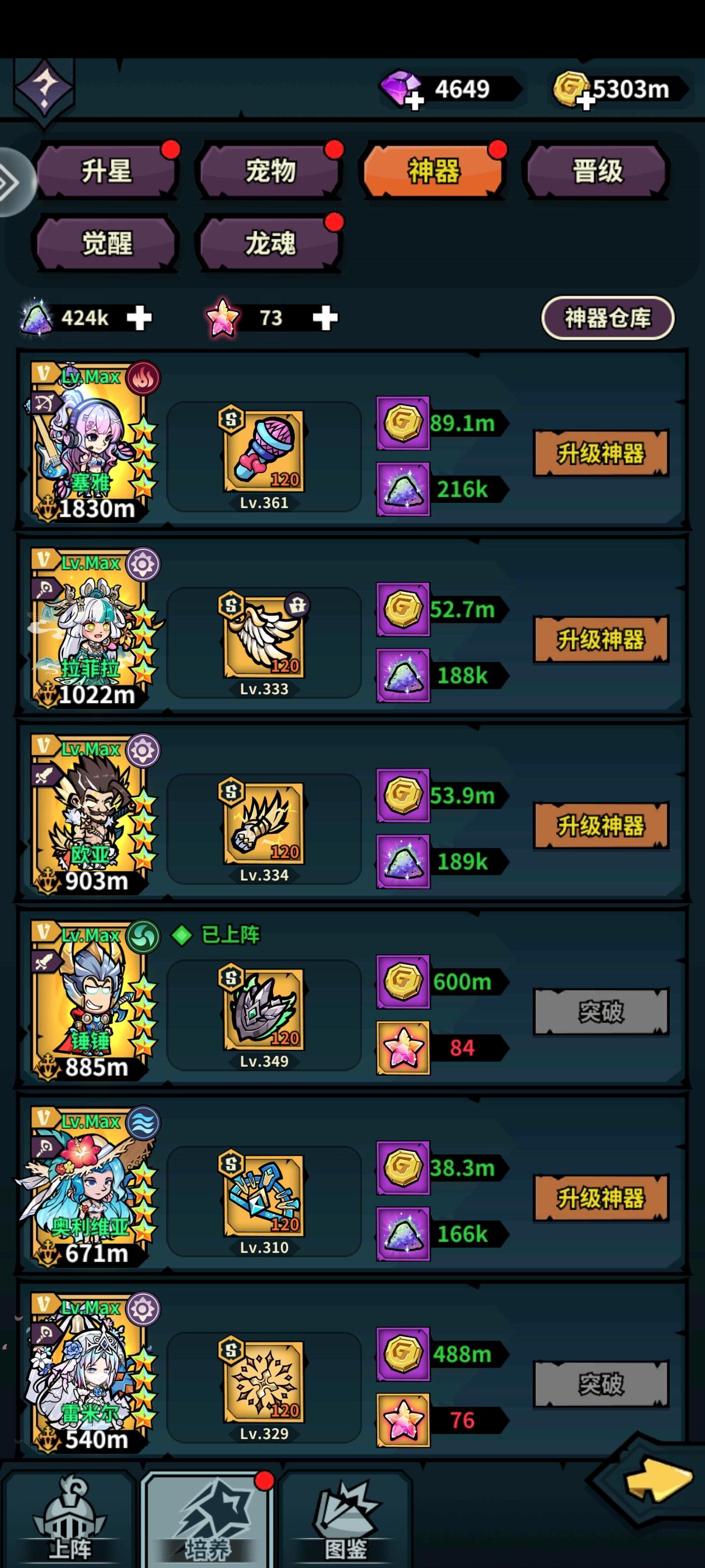 之前卡五水赛雅扛不住,把武器双倍攻击换成了吸血,有点后悔,因为觉醒40了变得能抗了一些,就把宠物换蜜蜂了,战力低了好多,实际还会更低,技能减伤的宝石给拉非拉了,带了个七级的暴击。最近一直在拉鲨鱼和米迦勒,赛雅和拉菲基本没有提升。
