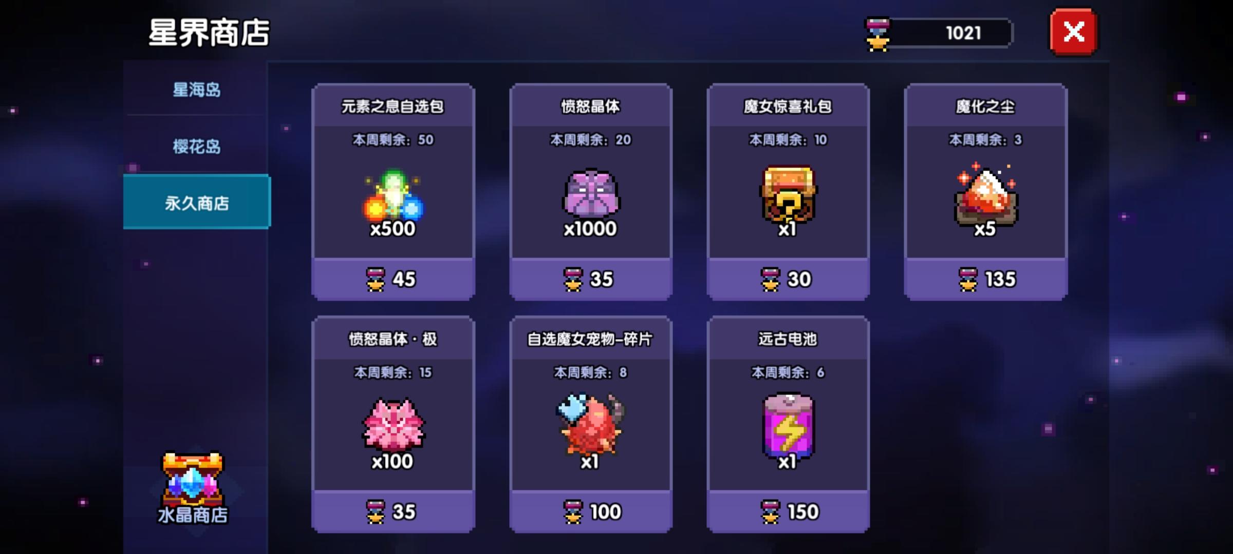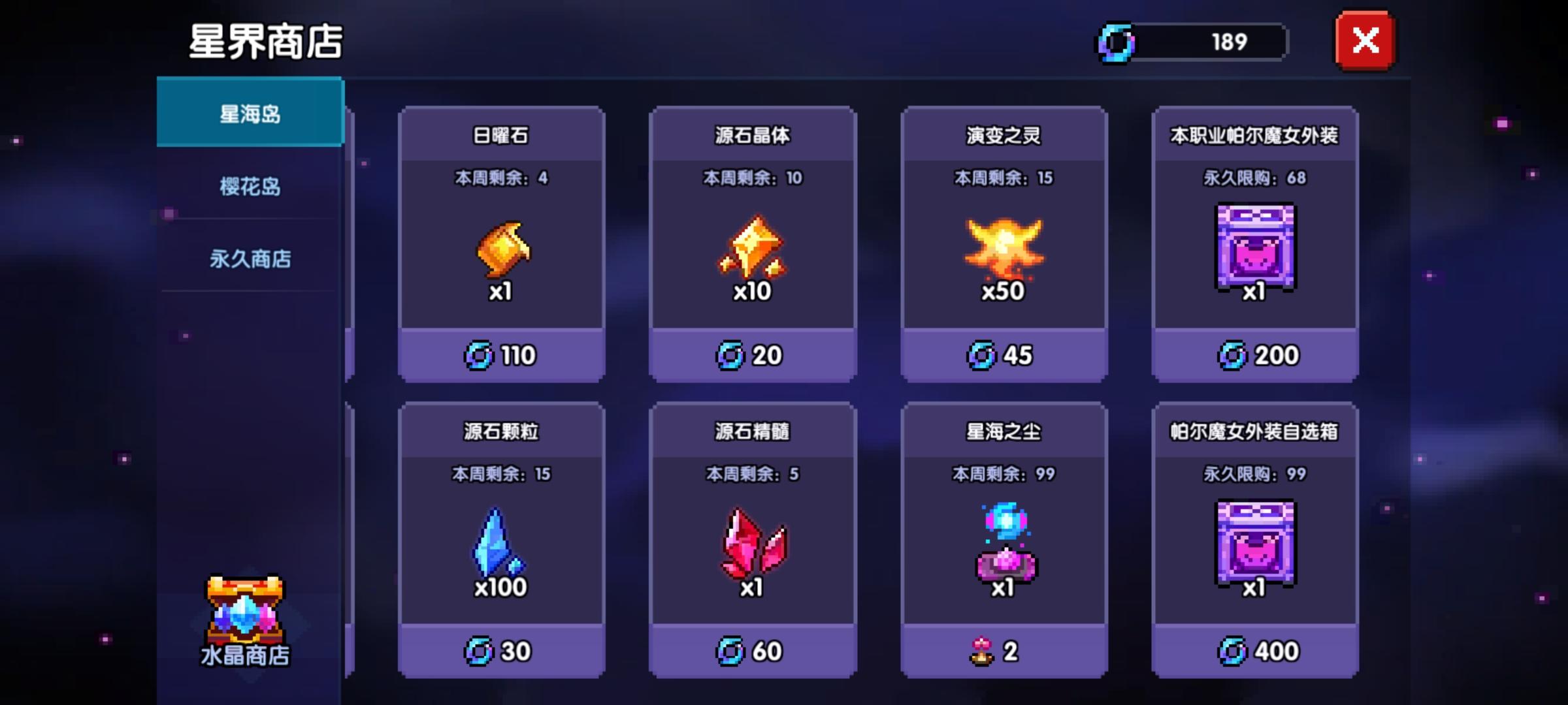星界的每周一刷新,分为三个商店:【星海岛】【樱花岛】【永久商店】(星海和樱花的布局相同)这个就看打多少次星界,但是前两个商店优先级最高的肯定是演变之灵,宝石强化没有满45级的话,也可以兑换原石晶体,原石精髓(黄碎,红碎)最后就是弄外装。而帕尔这个宠物建议后期补羁绊的话再兑换。那个紫色宠物虽然没什么用,但是辅助可以带着总比没有好(前期不建议搞辅助)安朵斯也是补羁绊的时候再换,而梅花鹿这个也是补羁绊的时候再买。【永久商店】就是红尘,魔女蛋碎片,有多出的再换惊喜礼盒,再剩下的就换元素之息。不想玩这个惊喜礼盒的,可以直接换元素之息
