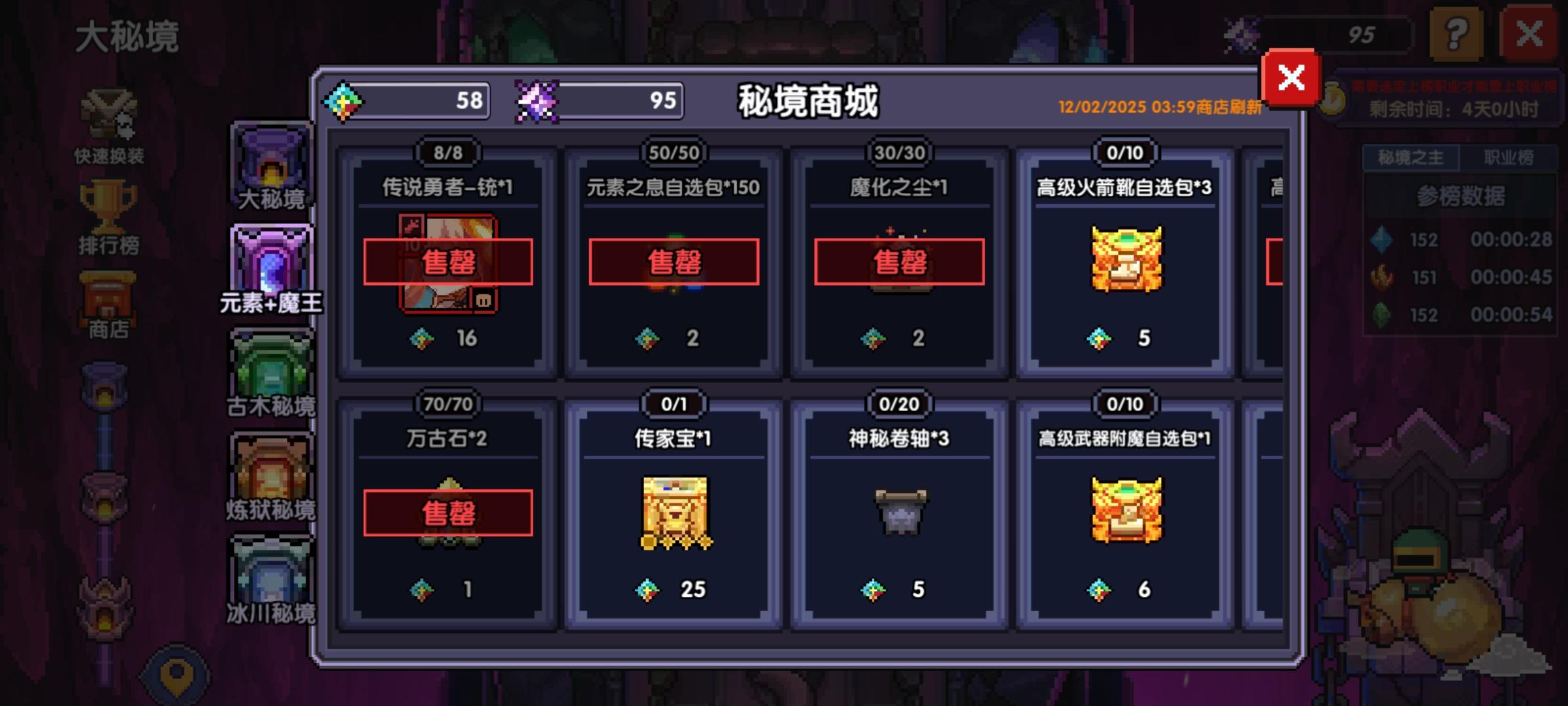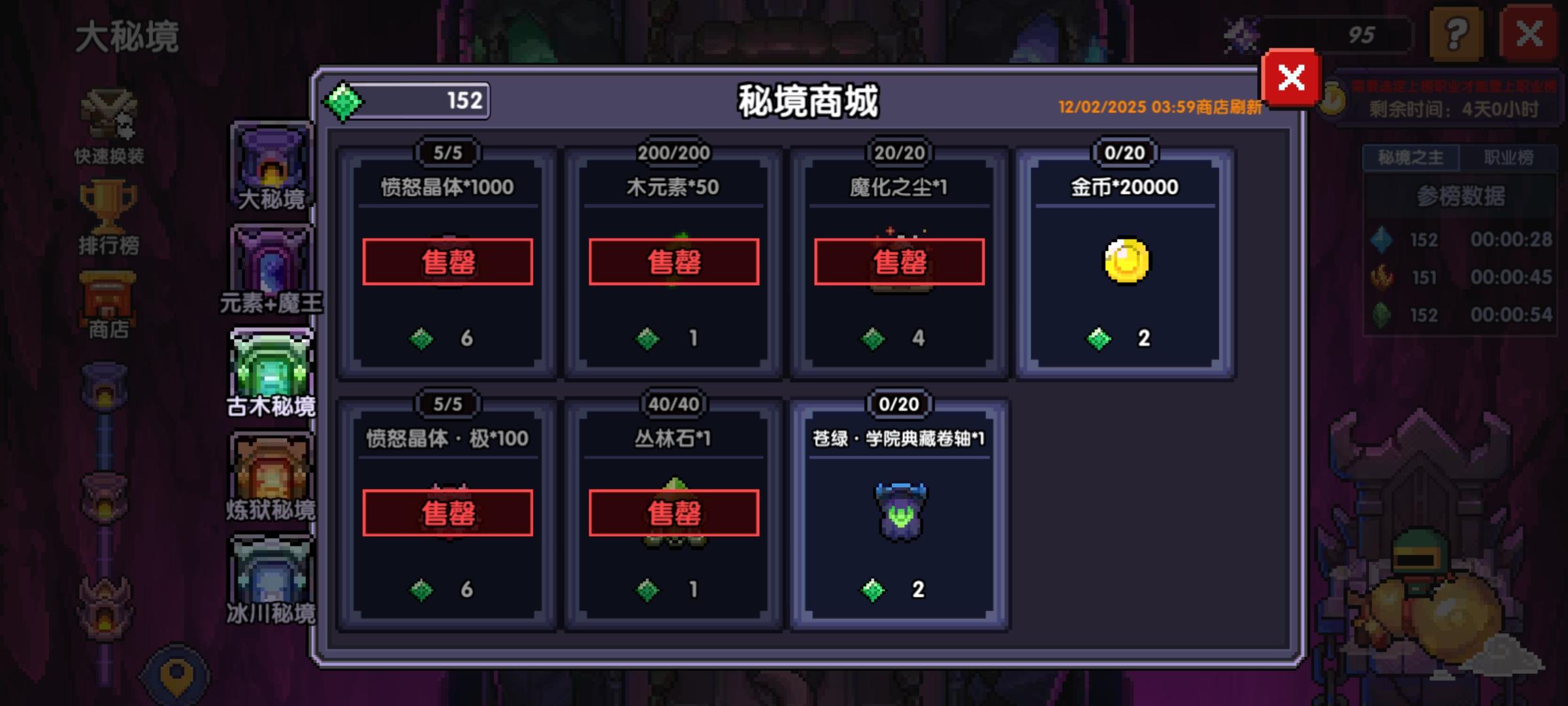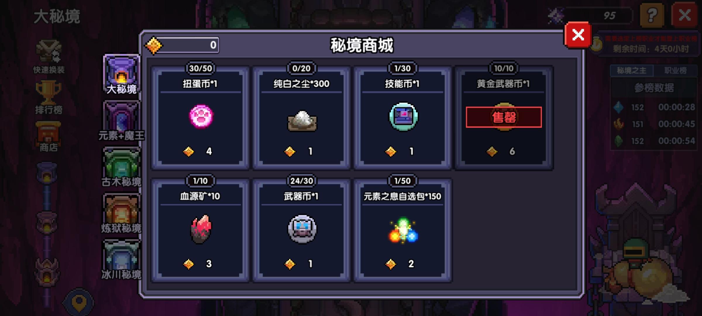 大秘境则有五个商店,第一个商店的黄色代币,只有那些,而且商店也不会刷新。剩余四个商店则是有标注时间刷新。第一个就兑换黄金武器币宠物币。第二个商店就是红尘和万古石,魂卡每次都会变,所以有需要的可以兑换。前面白色卷轴,有需要的兑换不需要的话完全不用兑换,后面的紫色卷轴,建议前期就开始兑换(如果没打到魔王秘境的就当我没说)宠物前期建议兑换,后这些普通宠物都搞得差不多的话,就不用兑换了。药就是需要的兑换。后面三个商店基本上是一样的,就元素不一样元素,万古石,红尘,经验卷轴正好能全部兑换(不需要经验卷轴的不换)