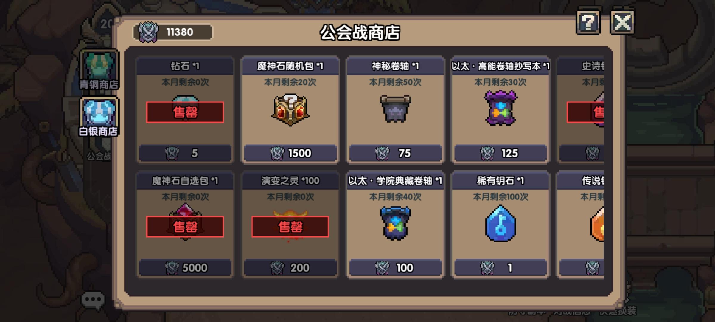 公会战每月1号刷新,有青铜商店主要兑换副职与技能不需要技能的话就不要兑换用来升星,弄副职业就行。而白银商店好东西就多了,钻石和演变之灵无需多言。还有经验卷轴,但是不建议兑换白色的,因为白色的需求量不大而且每个月获得的代币数量也有限。当不需要兑换蓝色的时候就可以看向宝石了,建议换自选宝石。