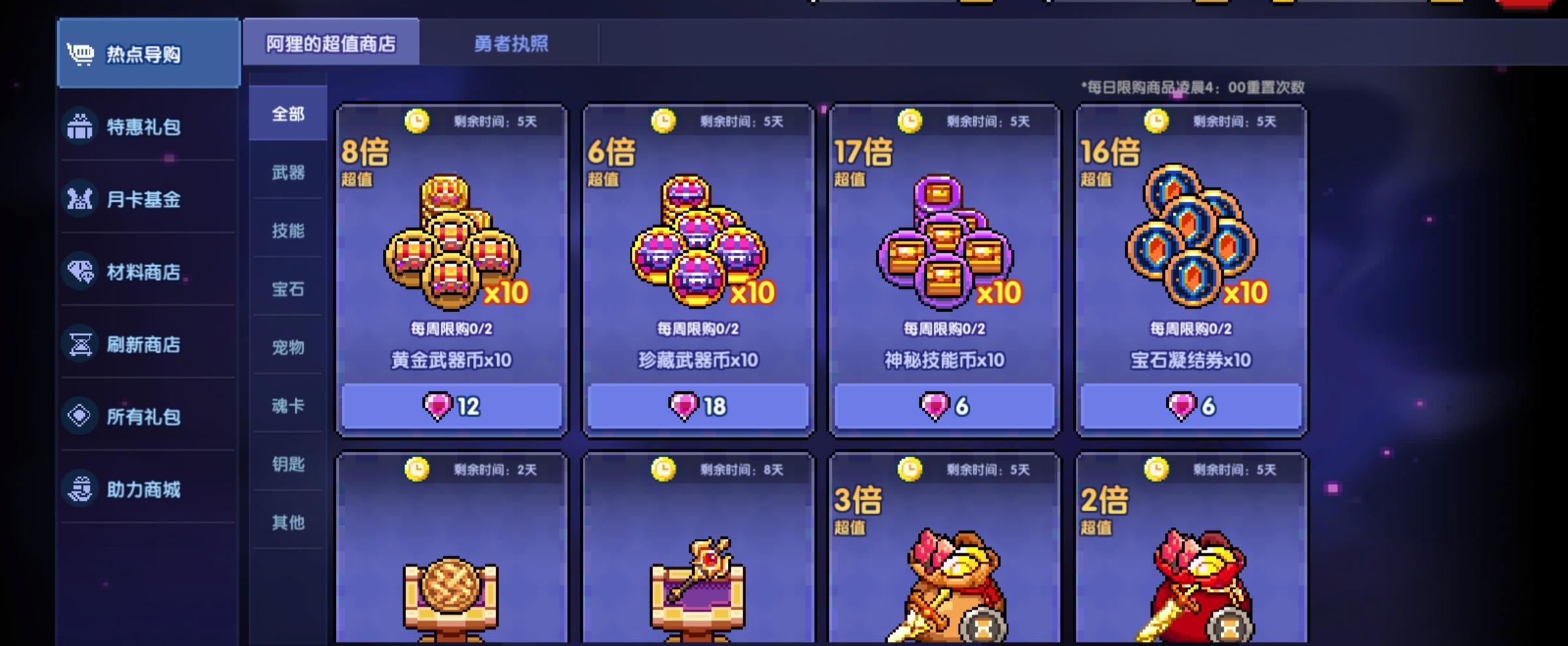商城就很多了,但我认为主要就分为每日的钥匙,月限购,刷新商店,材料商店和肋力商店这些。每日的钥匙肯定是要买,按需购买缺什么类型的买什么类型。建议买的就是限定的钥匙和启示系列,启示的系列是会更新魔女的(比如说下一个新水也会在这里),而限定钥匙则不会更新。而且建议在所有礼包中筛选购买钥匙可能还会有惊喜(因为每次出现新武器的时候,当前这个武器的钥匙每天会多投放一把)