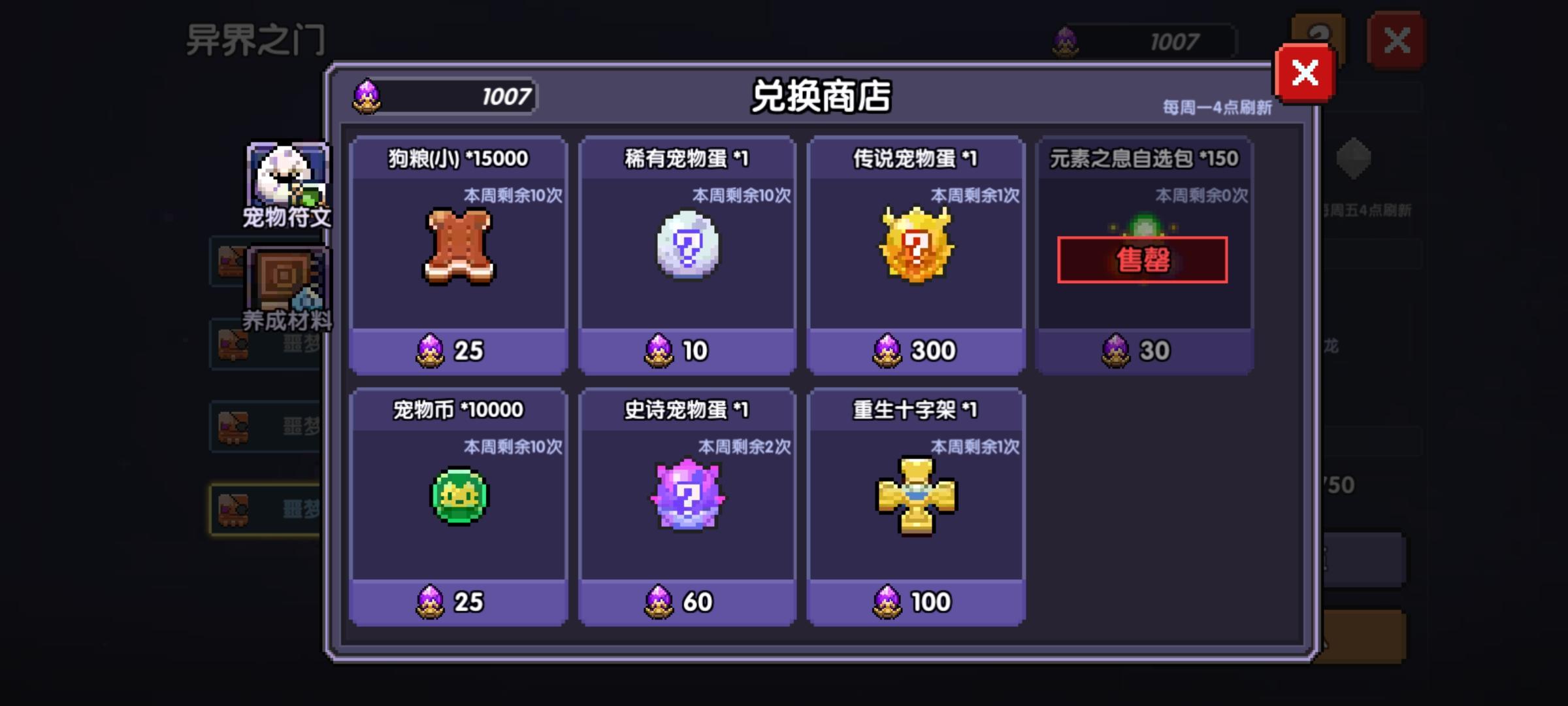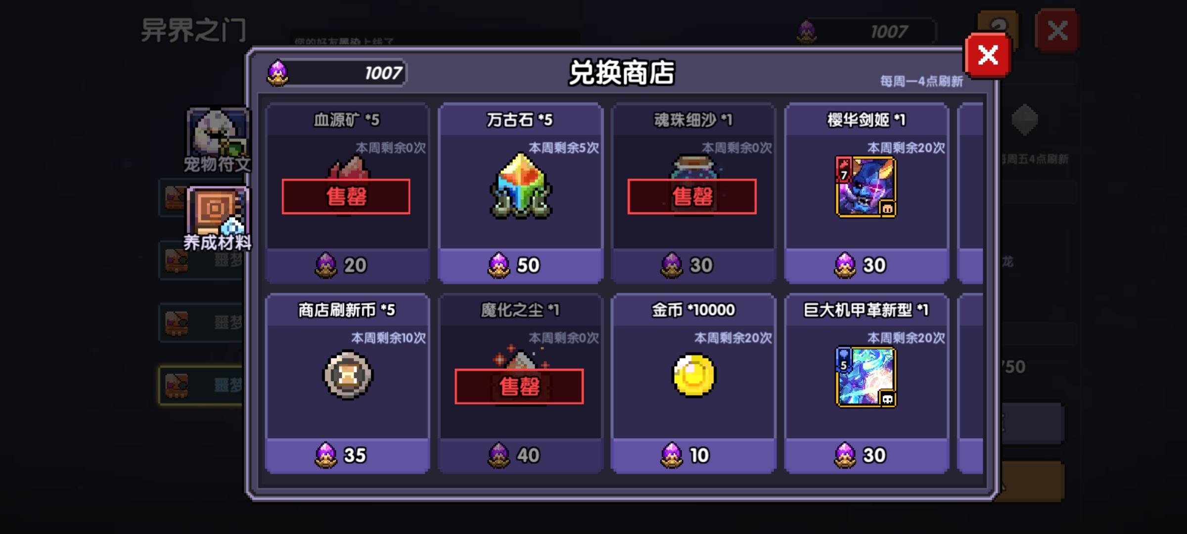 异界之门的每周一刷有,有两个商店【宠物】和【养成】。【宠物】中重生十字架是重置等级的,有需要的兑换。宠物币前期如果没满的话也建议。而白色和紫色还有橙色宠物我的建议是在橙色以下宠物都没有五星的情况下可以兑换。如果只剩红色宠物没有五星的话就不用。元素之息,则是在于代币充裕的情况下再兑换【养成】中的万古石,细沙,红尘都是珍贵资源。前期也可以搞刷新币,毕竟还是很需要的。每一周都会刷新一种魔女系列的武器碎片有需要的话可以买(一周才给五片)