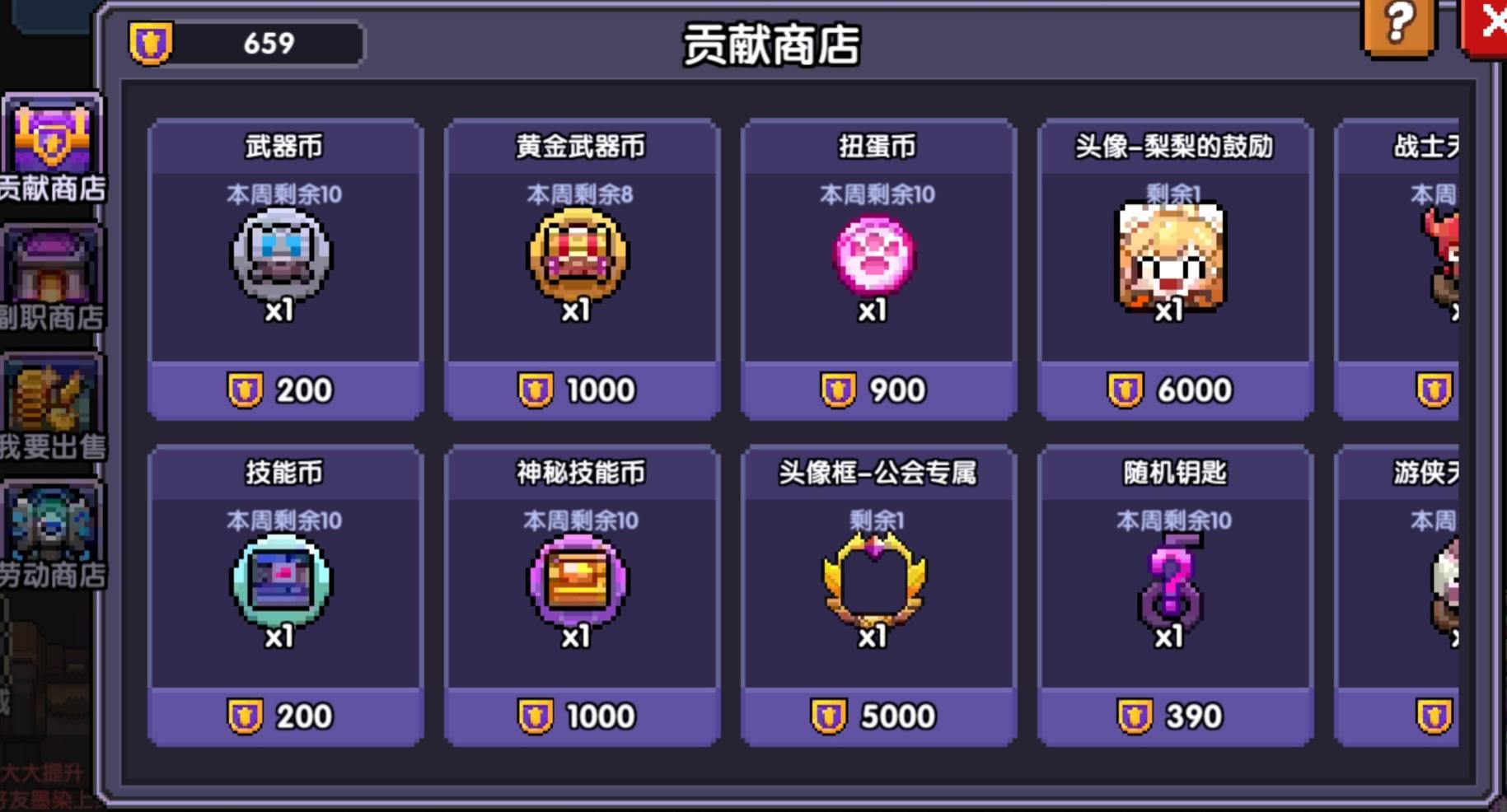 公会的每周一刷新,有两个商店(副职商店肯定是换最好的)【贡献商店】和【劳务商店】。【贡献商店】就是黄金武器币或宠物币,前期需要魔女宠物或者羁绊,都是需要宠物币的所以优先建议宠物币。【劳务商店】就是兑换万古石,黄金币,红尘和矿。万古石的获取途径本来就不多,而且新的装备将在明年2月份出现,所以这个万古石还是建议。红尘也是需要,平民白嫖满级需要几年时间。红石和绿石还有技能币也是之前的建议。需要的兑换