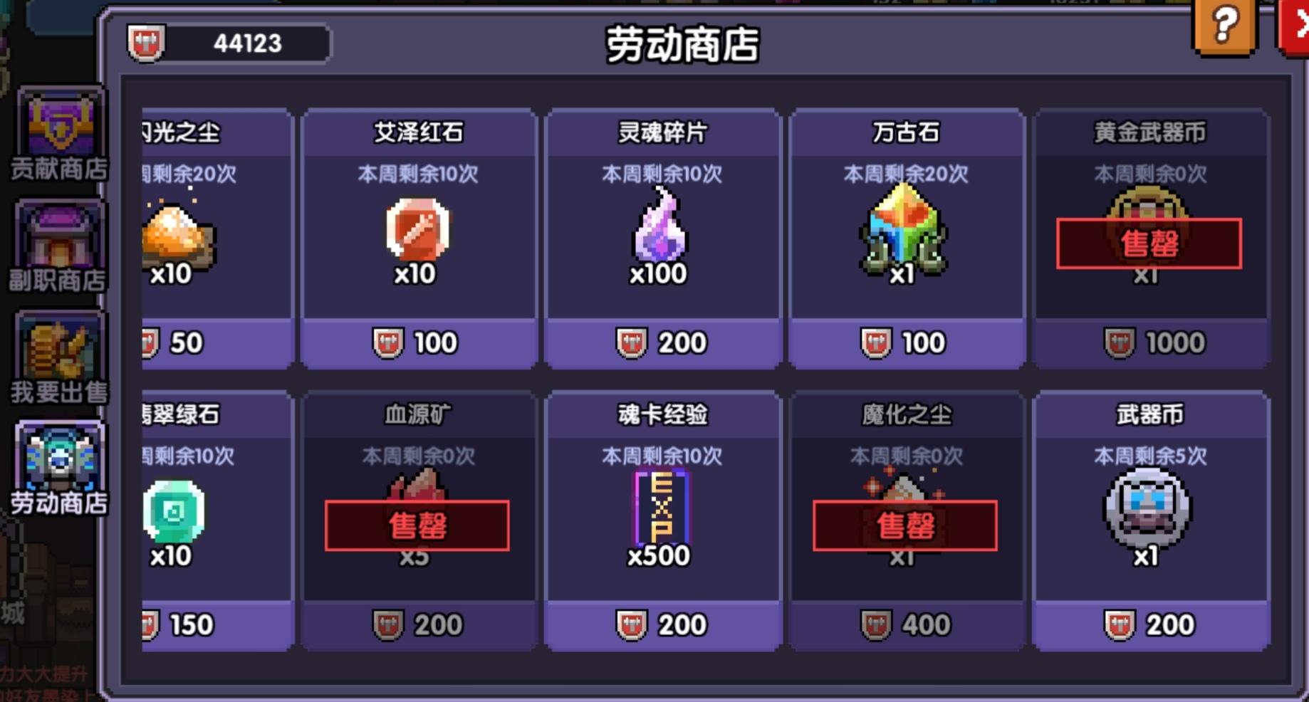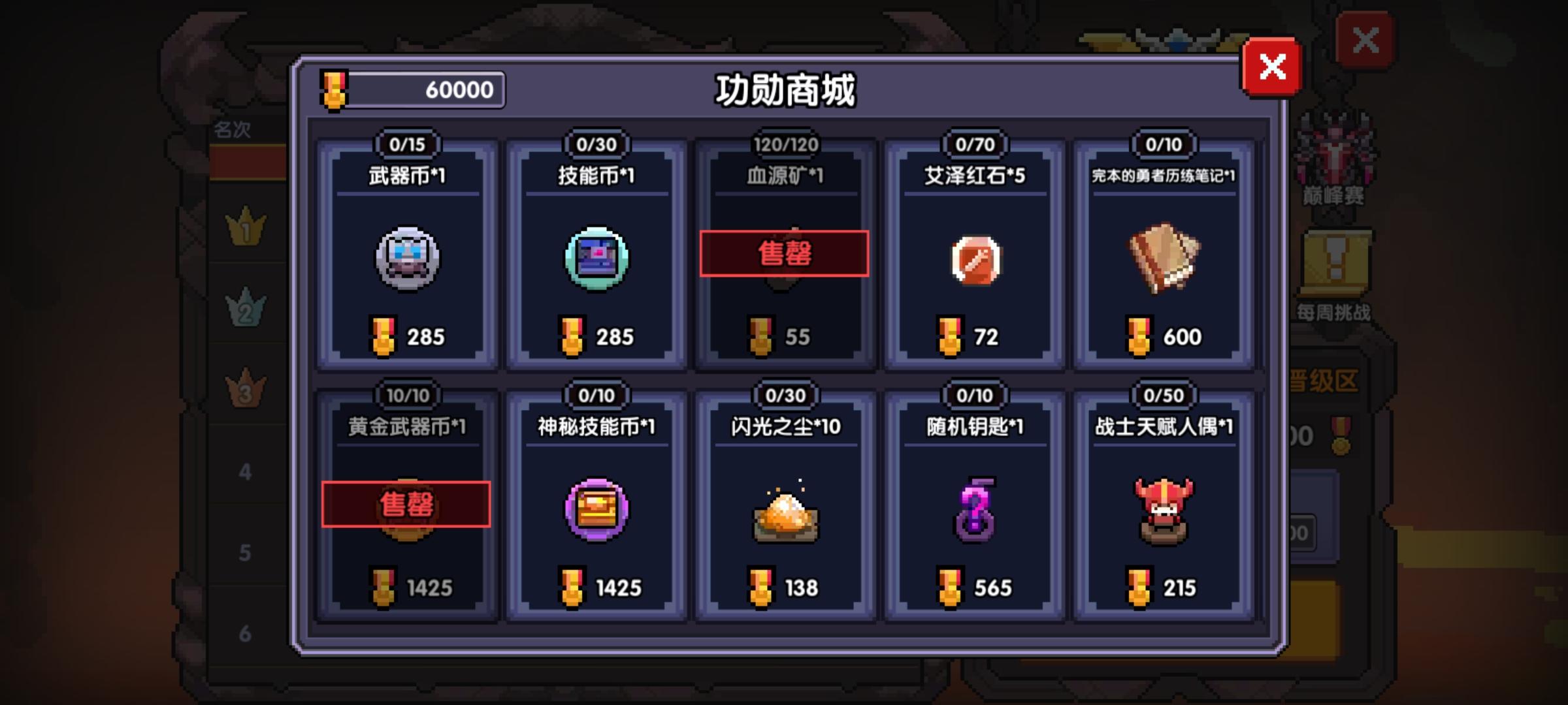 竞技场的每周一刷新,主要兑换的就是黄金武器币与矿石。这两个无论前期后期都是需要兑换的,如果缺少武器狗粮的话,可以兑换普通武器币。如果技能还没有抽出来的话,可以兑换技能币(就是当前BD的技能,如果技能都没有这个优先级最高),缺少红石的话可以兑换红石。这个完本笔记,其实我并不建议兑换,因为后面会溢出很多的,只是前期比较缺而已。(周赛和月赛都可以获得笔记)后面还有个元素之息是在,不缺物资的情况下可以兑换。玩偶是需要升级天赋的话兑换。