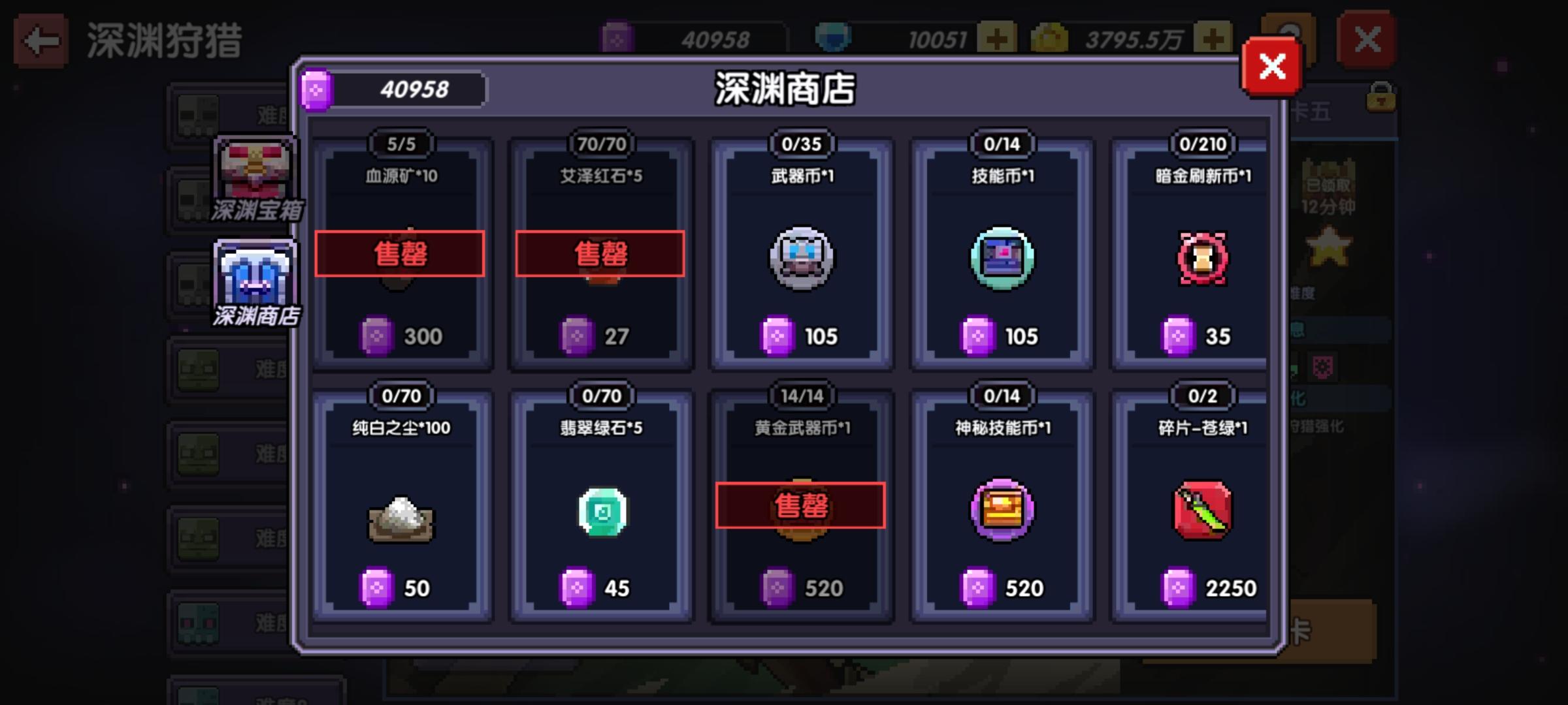 深渊狩猎每周一刷新,面那个深渊宝箱就不用看了,这个商店主要对话的也是矿和币思路和竞技场一样,缺红石兑换红石,缺绿石兑换绿石。技能没抽出来的话兑换技能币,苍绿这把武器没什么用